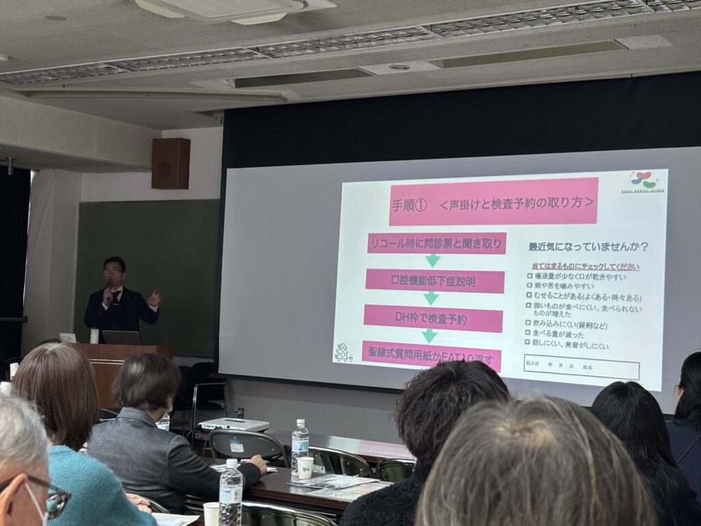 歯科医院で勤務する歯科衛生士による口腔機能低下症の早期発見と検査、評価、その後の適切なアプローチの仕方を学び スクリーニング力をつけるためにいろいろとお話ししていただきました。